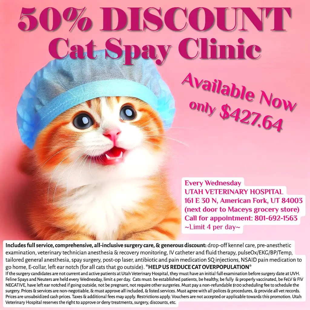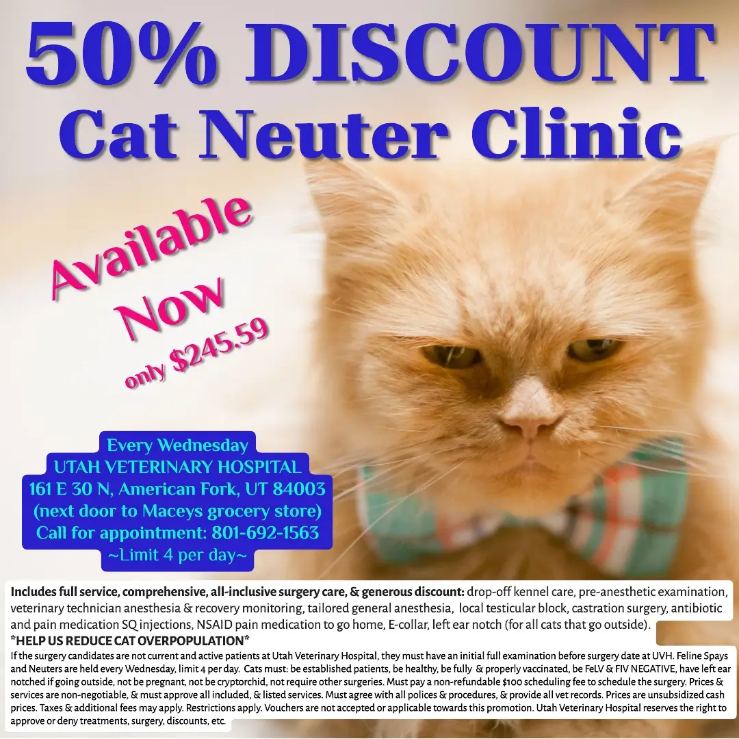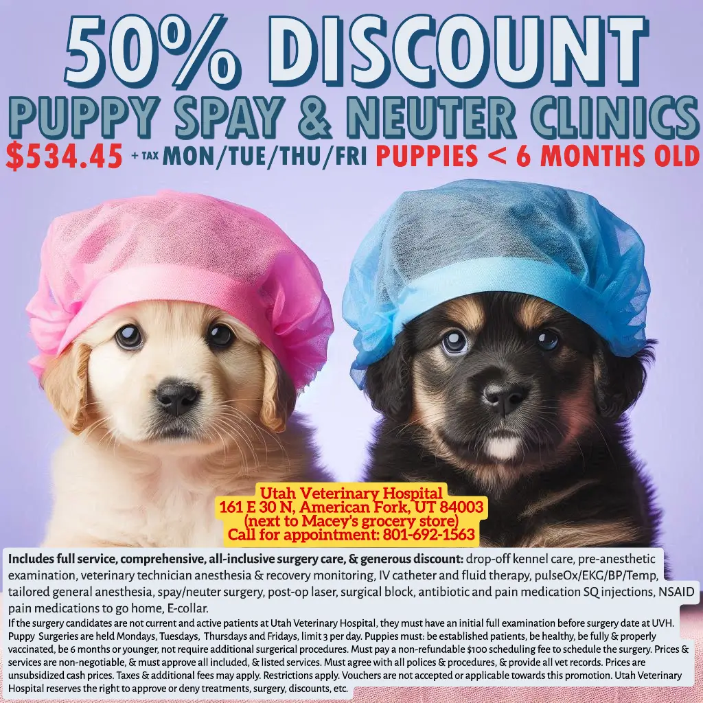 - Discounted Spay and Neuter Packages that include all of your pet needs for such surgical procedure (preanesthetic examination, hospital intake and kennel, designated technician care, IV catheter, full anesthesia, local anesthesia for neuters, sterilization surgical procedure with equipment and full monitoring, electrocardiogram with pulseOx, microchip with life-time registration, pain medications to take home, Elizabethan collar, perioperative injections for pain and to prevent infection – Average savings over $210
